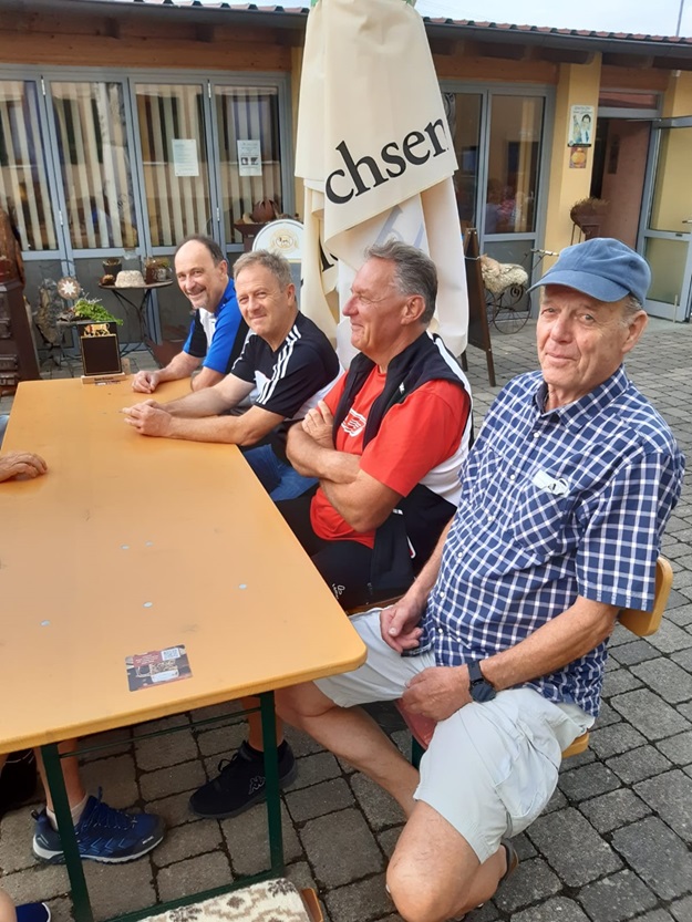 Um zehne trafen wir uns an der Halle. Karl, Dieter und ich. Wir starteten pünktlich und fuhren nach Giengen. Am Bahnhof warteten Hans und Claus auf uns. Nach kurzer Beratung fuhren wir weiter nach Oggenhausen. Beim König angekommen stellten wir fest, dass der Biergarten geschlossen war. Wie schade. Unser nächstes Ziel war dann Oberbechingen. Auf der Fahrt bis Oberbechingen hatten wir starken, kalten Gegenwind. Unser Hans trotze, nur mit Hemd bekleidet allem. Man weiß ja, dass Hans ohne 'e' fährt, alle anderen an diesem Tag mit 'e'…. Der Biergarten in Oberbechingen war eine Wucht. Schweinshaxe und ein tolles Bier – unglaublich gut (auch ich hatte mir ein normales Radler bringen lassen)!
